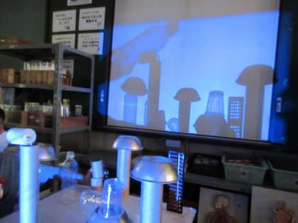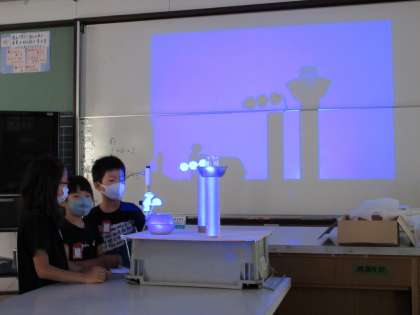 教室のカーテンしめきり,真っ暗の中でプロジェクターの光を利用してできるいろいろなかげの形を楽しみました。
