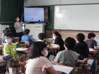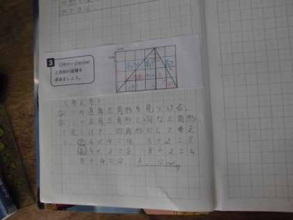 今日は,三角形の面積の求め方を考えました。これまでに学習した,長方形や直角三角形の求め方をもとにして,解いていきます。ノートにもしっかりと,自分の考えを書いていました。