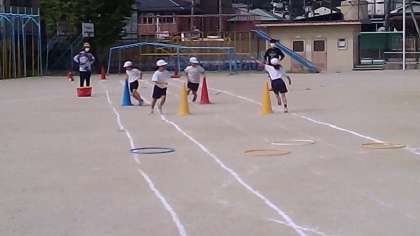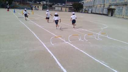 ミニハードルを跳んだり,コーンを回ったり…いろいろなミッションをクリアして,ゴールを目指します。