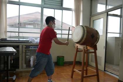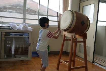 音楽の時間に和太鼓に挑戦しています。大きな太鼓を強くたたくと子どもたちから「お腹がいたくなる」と音の響きを感じた声も出ていました。