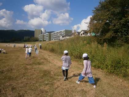 今日は天気にも恵まれ,絶好の校外学習びより。2年生は虫取り網と虫かごをもって,いざ桂川へ!