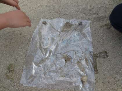 運動場にビニール袋を敷き,その上に水を流します。