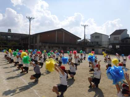 午後からの演技名が決まりました。「一心絢爛〜魂で紡ぐOne Story〜」です。それぞれが心を一つに美しい演技をすることで,新たな物語を作っていこうという思いを込めています。自主練習なども含めて,必死に練習をしている姿が見られます。今日の練習では,一部の曲で使用するポンポンを使いました。一気に華やかになります。本番では,両手にもって表現します。今から完成が楽しみです。