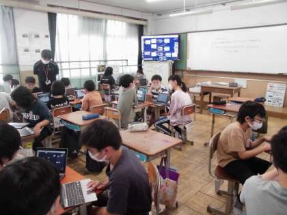 総合的な学習の時間は,梅津の魅力を伝えることをゴールに取り組んでいます。いまは,グループでポスターや新聞を作っています。休み時間にもこつこつ色を塗っている人もいます。これは,うめづタイムで,6年生に発表します。