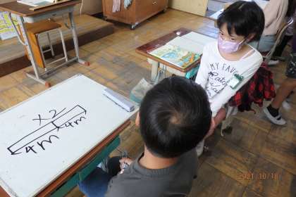 算数「何倍でしょう」の学習では,何倍かを求めるにはどのような計算をすればよいかについて考えました。今までに学んだ図のかき方を生かし,式を立てました。友だちの図を見て理解したり,友だちの図を使って,自分の言葉で説明したりすることができました。