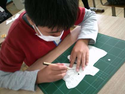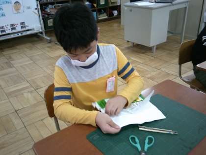 牛乳パックの表面が気持ちよくはがれ,その感触を楽しんでいました。そのあと,ちょうちょの絵をかき,模様をカッターで切りぬいています。昨年度まで切り絵をしてきたので,高学年は上手にカッターを使っていました。