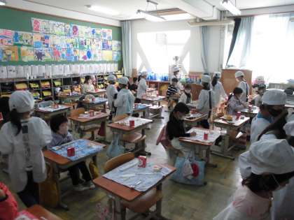 給食の準備が上手になっています。みんな同じ量になるようにお皿に入れたり,周りをよく見て配ったりして,自分の役割を果たしています。当番ではない人は,静かにコロナ対策をして待っています。今日もしっかり食べ,元気いっぱいでした。
