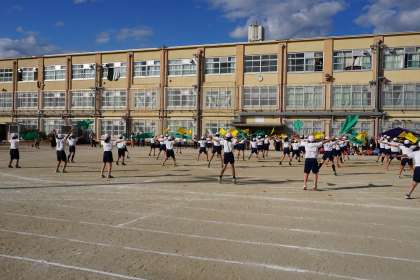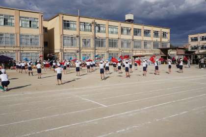 午後はたくさん練習してきたフラッグを使った演技でした。教室を出るまで何度も「ここのふりは右から?左から?」と何度も入念にふりの確認をしていた子どもたちも,入場の音楽が流れ始めると表情は一変し,堂々とグラウンドへと入っていきました。今日は風も子どもたちに味方し,赤・青・緑・黄,4色の旗が運動場にはためきました。