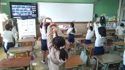 始まりの言葉や校長先生からのお話を聞いたあと,全校ダンスをして,体をほぐしました。