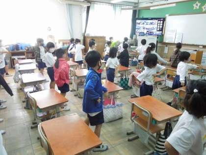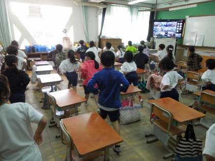 始めの言葉と校長先生からのお話の後は,全校で準備運動をするために全校ダンスをしました。