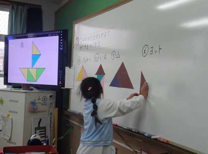 今日は,三角形の色板並べて,教科書の形を作りました。