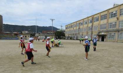 4年生の体育では,今日から陣取りゲームが始まり,ボールパスの練習をしてからゲームをしました。