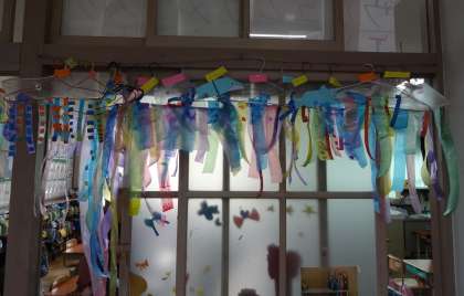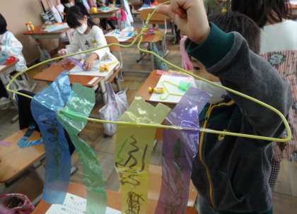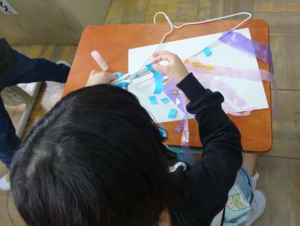 先週の図画工作の時間に,ハンガーにひもやテープなどを貼って,風にひらひらゆれる飾りを作りました。「たこみたい。」「もっと長くした方がきれいかな。」と,想像を膨らませながら楽しく作っていました。