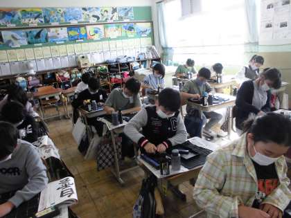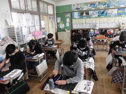 書写では,まず初めに「墨を磨る」活動から行っています。