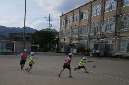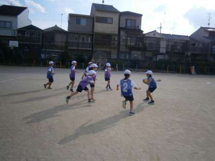 最初はボールを持つとうっかりゴールへと歩いてしまう子もいましたが,ルールの確認やパスの練習を重ねて,段々とやり方がわかってきた子どもたち。準備や片付けも役割を決めて子どもたちで行っています。大事なのはチームワーク!力を合わせてゴールを目指せ!