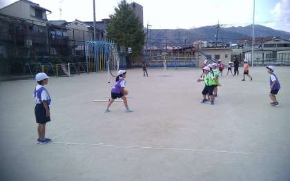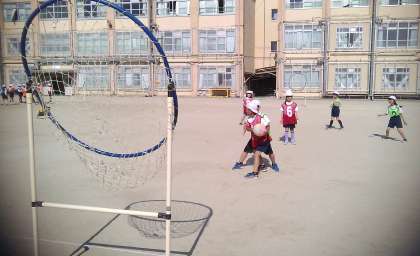 体育の学習で,「パスゲーム」に取り組んでいます。ルールや進め方に慣れて,いろいろなチームと対戦することを楽しみながら,活動しています。