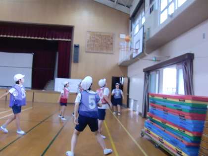 バスケットボールでは,相手に触らないようにしながら試合をしています。シュートやドリブル,パスにも慣れ始め,スピード感のある試合になってきています。子どもたちは作戦の中でも「パスはバウンドさせよう!」「広くコートを使おう!」と声をかけあい協力しながら活動しています。