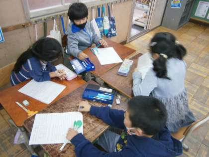 「写真ではこうなってるよ。」「長さは12センチメートルだね。」教科書を読み,説明の工夫に気をつけながら自分たちでおもちゃ作りをしました。少し複雑でしたが,どんな説明の仕方がわかりやすかったか,意見を出し合い,次は生活科で作ったおもちゃの説明文を書いていきます。