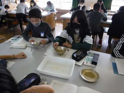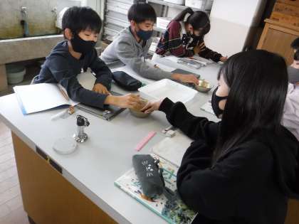理科では土地のつくりと変化の学習をしています。今日は縞模様ができるのはなぜなのかを実験しました。土地は,「どろ」「砂」「れき」などでできることを知り,それぞれがどのようなものであるのかを観察しました。じっくり見たり,手で触ってみたりしながら様子を見ていました。