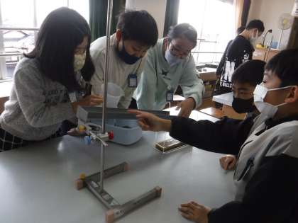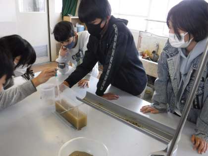 その後どのようにして縞模様の層ができるのか装置を使って実験しました。前回は自分たちで考えた方法でなかなか縞模様にならなかったグループも今日はしっかりと縞模様をつくることができていました。