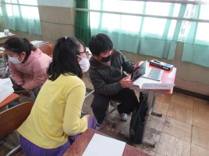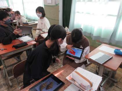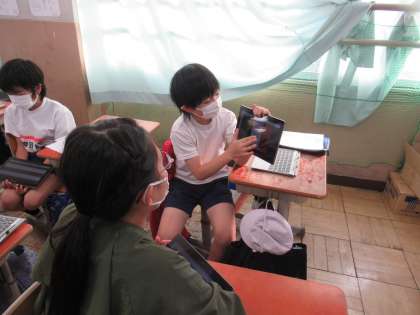 タブレットを使ってスライドをおくりながら,自分の行きたい国について話をする子どもたちの顔はとてもかがやいていました。
