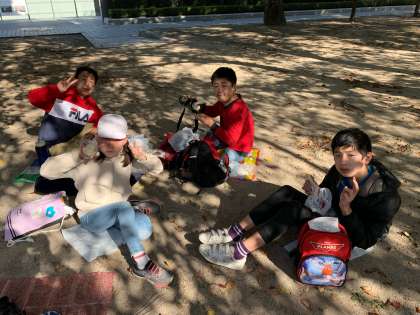 > 平和記念公園について平和集会をした後、お昼を食べました。美味しそうにおにぎりを頬張っていまた。