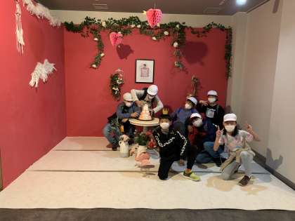 城のエリアには、トリックアートや撮影スポットがたくさん。タブレットを持ってみんなで写真を撮りました。