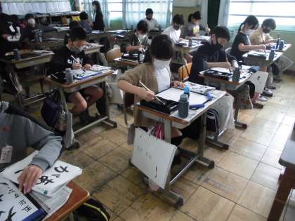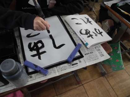 今日は,「穂先の動きに気をつけて書こう。」というめあてで,「あこがれ」と書きました。ひらがなは,漢字と違い,曲がるところが多いです。その曲がるところの穂先をよく見て,運筆します。上手に書けたかな?