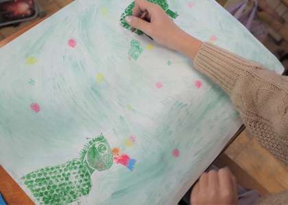 版でうつしたものに,背景や動物・人物を描き加えました。