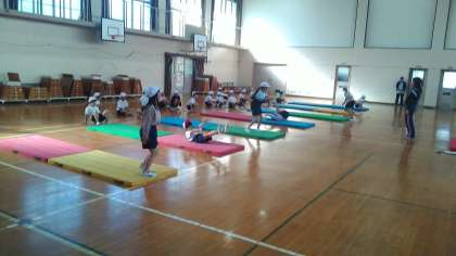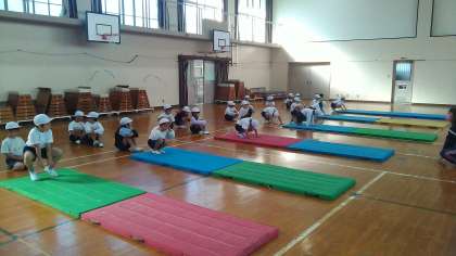 丸太転がりや前転がり,後ろ転がり,川とびなど,いろいろな技に挑戦中です。安全にも気を付けながら,できる技を一緒に増やしていきたいと思います。