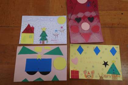 外国語活動では,ほしい形を集めてカードを作りました。クリスマスが近いので,△を使ってクリスマスツリーを作っている子や,自分の好きなものを表現している子などがいました。次は完成したカードを紹介し合います。