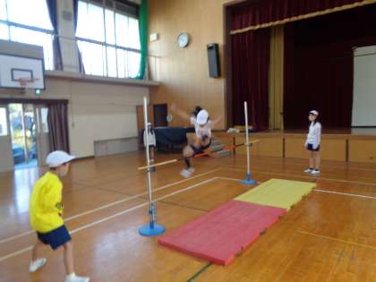 体育科で「高とび」の学習を行っています。初めてする高とびに子どもたちは緊張している様子でした。「助走・踏切・空中動作」を意識しながら,自分の記録が更新できるように頑張っています。どれだけ記録が伸びていくか楽しみです。