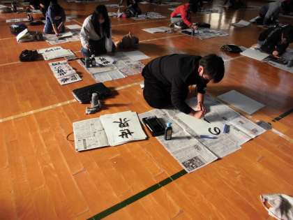 今日は,書き初めをしました。画仙紙を床に広げ,いつもとは違う姿勢で,心を落ち着けて書いていました。