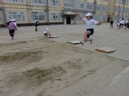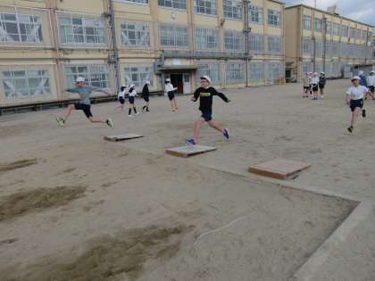 体育科「走り幅跳び」の学習では,自分に合った助走距離を見つけながら,自分の目標記録を目指して活動を進めています。まずは,片足での踏み切りと両足での着地に気を付けて取り組んでいきます。