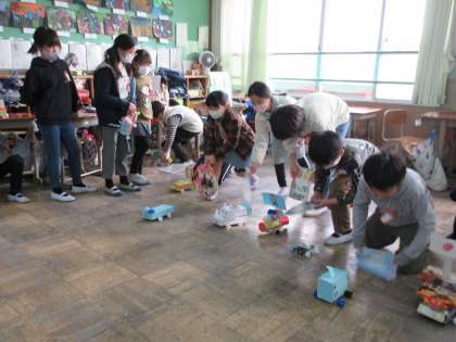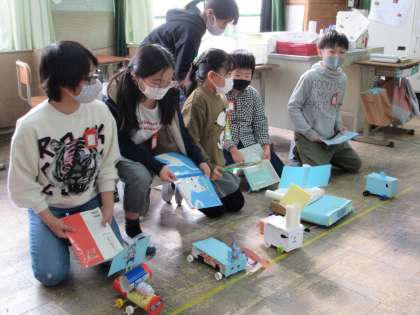 最後に完成したドリームカーを走らせて,楽しみました。風を送って走るドリームカーを見て楽しんだり,みんなで並べていっせいに走らせてレースをしたりなど,笑顔いっぱいで楽しむ姿が見られました。