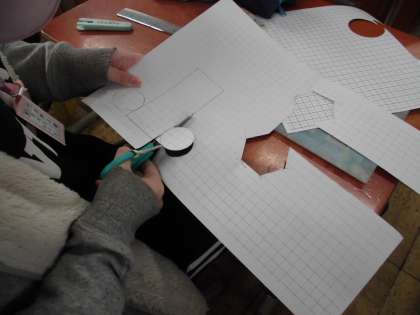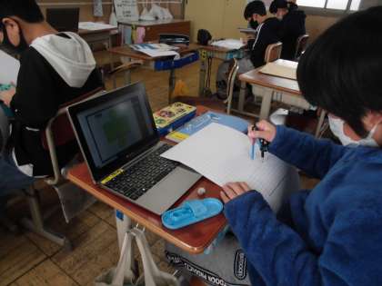 算数では,側面の横の長さに気を付けて円柱の展開図をかき,組み立てました。側面の横の長さを求めるには,円と正多角形で学習した「直径×3.14=円周」という公式を使う必要があるので,子どもたちも思い出しながら取り組んでいました。
