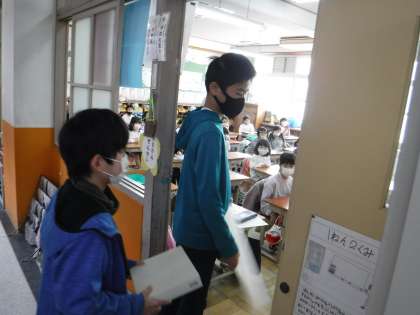 今朝梅津まつりの遊びを届けに行きました。一年生から順番に回していってもらいます。直接説明に行くことができないため,遊び方などを書いた紙をつけて持っていきました。「すごろくを作りました。楽しんでください」と言葉をかけて渡していました。