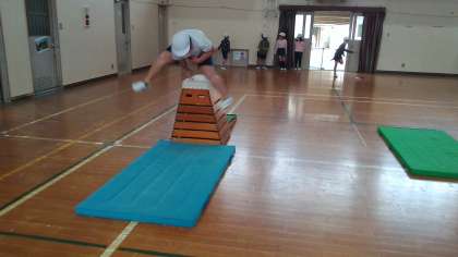 とびのり・とびおり,またぎのり・またぎおり,横とびこし,開脚とび…などいろいろな技に挑戦している2年生。手のつき方や足の開き方に気をつけながら練習を積み重ねているところです。友達のよいところを伝えたり,アドバイスをしたりする姿も見られ,成長を感じます。