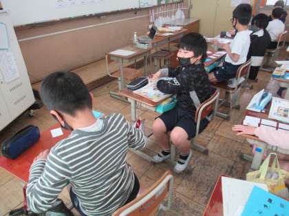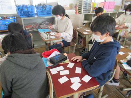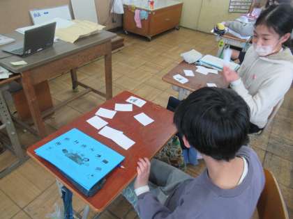 この単元の学習も中盤に差し掛かった今日は,人物の性格を伝える表現を学習しました。「She is〜」「He is〜」を使いカードマッチングゲームをしました。カードに書かれている人物の性格を紹介しながら,ペアを作っていきます。なかなかカードが合わずに苦戦していたチームもありましたが,カードに書かれたことを相手に伝える活動を楽しんでいました。