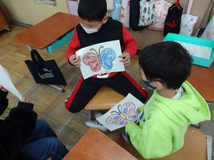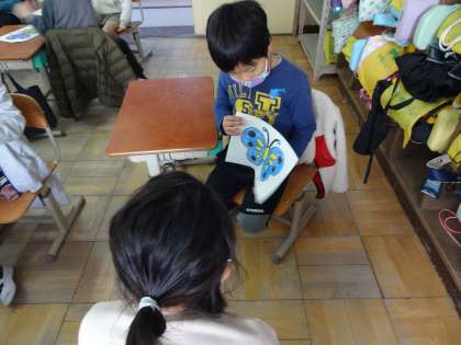 英語の学習で,自分の好きな色で塗ったちょうちょを紹介する活動をしました。「I like red.」など,自分の好きな色を英語で伝えたり,「Nice.」や「Good.」など,ジェスチャーをしながら反応をしたりすることもできました。