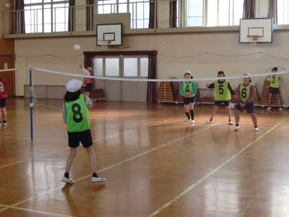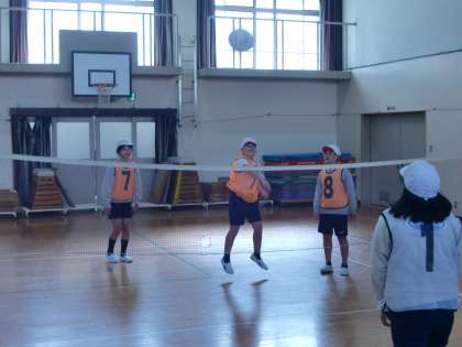 体育ではソフトバレーをしています。まずは,ボールの打ち方を確認し,チームでボールを落とさずに何回続けられるか練習をしました。その後,簡単な試合形式で相手チームと対戦もしました。子どもたちは楽しみながら取り組んでいました。