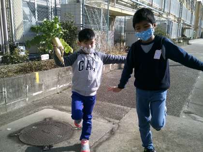 収穫したダイコンは鼻のような部分があるものであったり,片足立ちをしているように見える二股に分かれているものであったり,太くたくましく育ったものであったり,いろいろなダイコンが収穫できました。