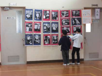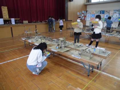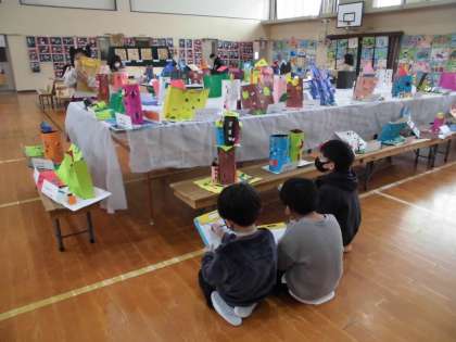 今日は,作品展の鑑賞にいきました。体育館に展示された作品を見て,「うわ〜すごい。」「どうやって作っているのかな。」と興味をもって,じっくり鑑賞していました。