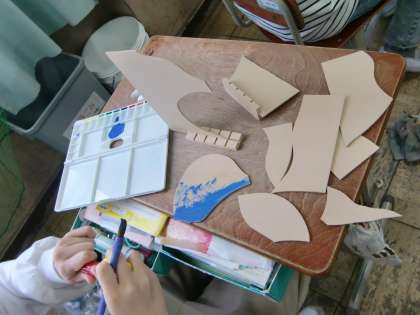 図画工作では板を切り,切った板を組み立てて,どんなものが作れそうかたくさん試しました。組み立てるものが決まった人から,板に色を付けました。作品の完成が楽しみです。