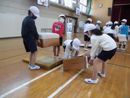 とびばこあそびの学習をしています。準備は,2人組や4人組で力を合わせて行います。「せえの。」と声をかけ合い,安全に気をつけている姿が見られました。