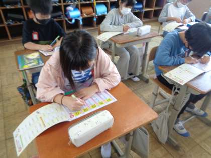 5年生になって初めての漢字の学習をしました。難しい漢字がたくさんありますが,子どもたちは一生懸命丁寧に書いていました。これからもたくさんの漢字を覚えてほしいと思います。