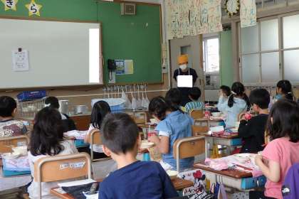 今週はまた「月組」さんのお当番です。「月組」「星組」のどちらもが給食当番を経験し、当番のお着替えや準備も少しずつスムーズにできるようになってきています。準備の最中には友だちと協力して、背中のひもを止め合っている素敵な姿も見かけます。