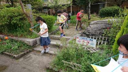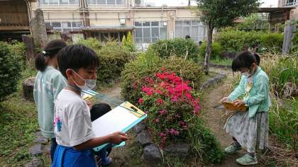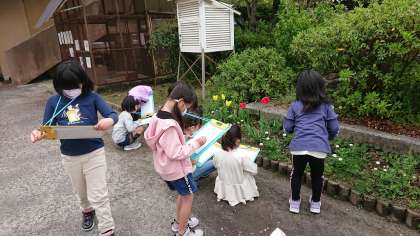 図画工作の「おはなみスケッチ」の学習で,画用紙片手に学校の春を探してスケッチに行きました。タンポポやチューリップ,ベンチにすわって見上げたところにある藤の花などの植物,アリやダンゴムシなどの生き物,心地よい風などいろいろ見つけた春をコンテとクレパスで画用紙にスケッチしました。素敵な春がたくさん見つかりました。