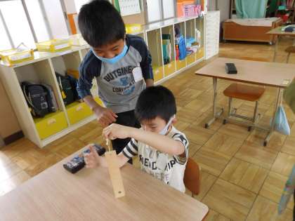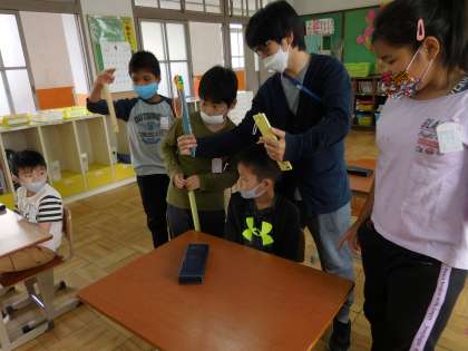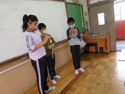 理科の学習で温度計のはかり方を学習しました。液だめのところは触らないことやメモリに目線を合わせることなどに気をつけました。6年生と4年生は繰り返しの学習になりますが,お互いに教えあっていました。