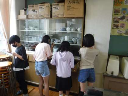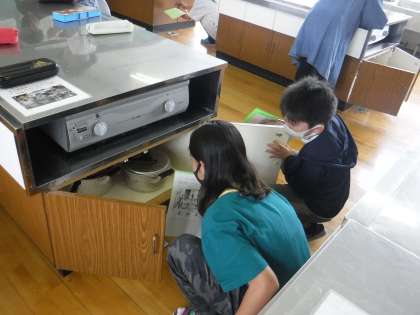 今日の家庭科では,家庭科室探検をしました。家庭科室にはどのようなものがあるのか調べました。さまざまな戸棚や引き出しの中を確認し,たくさんの用具があることに驚いていました。